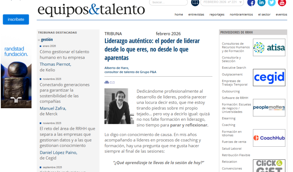 En este artículo, Alberto de Haro, consultor de talento en Grupo P&A, reflexiona sobre la importancia de parar y conectar con uno mismo para ejercer un liderazgo auténtico. Plantea que, en un entorno acelerado, muchos líderes actúan en piloto automático y pierden claridad sobre quiénes son y cómo quieren liderar. El artículo invita a recuperar la reflexión, entender fortalezas y límites y liderar desde la coherencia personal, no desde la apariencia. Puedes leer el artículo aquí.